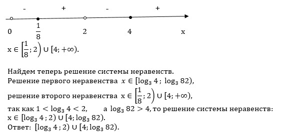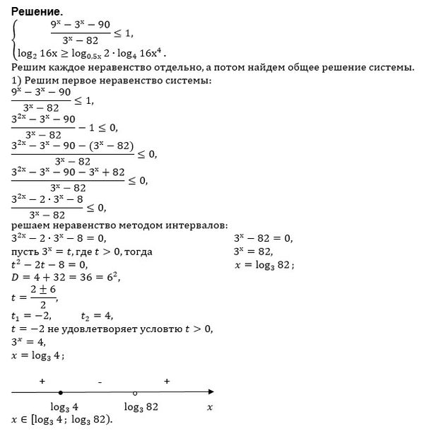 Решите систему неравенств [m] \begin{cases} \frac{9^x - 3^x - 90}{3^x - 82} \leq 1, \\ \log_2 16x \geq \log_{0,5x} 2 \cdot \log_4 16x^4. \end{cases} [/m]