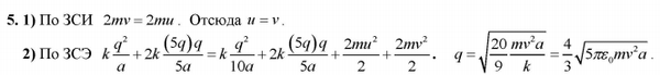 В вершинах равнобедренного треугольника со сторонами а, 5а, 5а находятся неподвижно три небольших по размерам положительно заряженных шарика, связанных попарно тремя легкими непроводящими нитями. Каждый из шариков, связанных короткой нитью, имеет массу m и заряд q. Третий шарик имеет массу 2m и заряд 5q. Короткую нить пережигают, и шарики начинают двигаться. В момент, когда шарики оказались на одной прямой, скорость шариков массой m оказалась v.