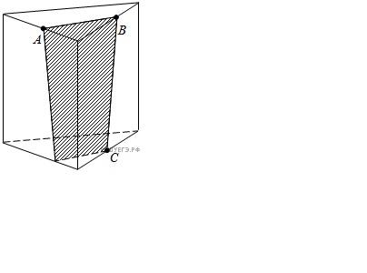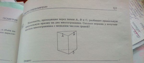 Плоскость, проходящая через точки A, B и С, разбивает правильную треугольную призму на два многоранника. Сколько вершин у получившегося многоранника с меньшим числом граней?