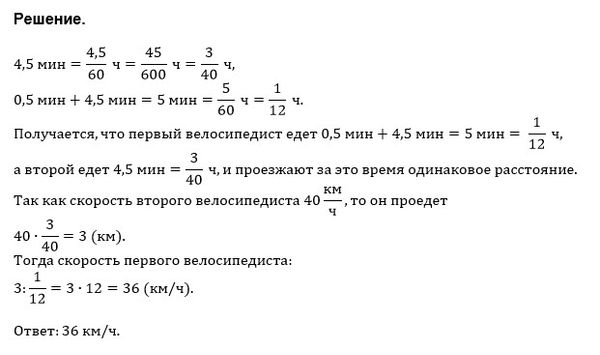 Со старта выезжают два велосипедиста. Второй выезжает через полминуты после первого со скоростью 40 км/ч и догоняет его через 4,5 мин. Какова скорость первого велосипедиста?