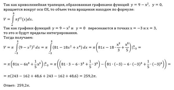 V=π ∫ ^(3)_(-3)(9-x^2)^2dx= =π ∫ ^(3)_(-3)(81-18x^2+x^4)dx= =π*(81x-18*(x^3/3)+(x^5/5))|^(3)_(-3)= =π*(81*9-6*54+(1/5)486)=259,2π