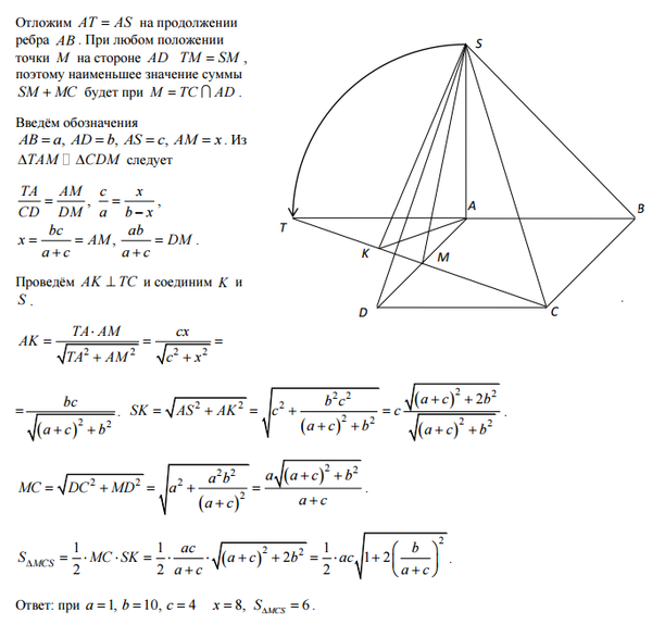Прямоугольник ABCD со сторонами AB = 1 и AD = 10 служит основанием пирамиды SABCD, а ребро SA = 4 перпендикулярно основанию. Найдите на ребре AD такую точку M, чтобы треугольник SMC имел наименьший периметр. Найдите площадь этого треугольника