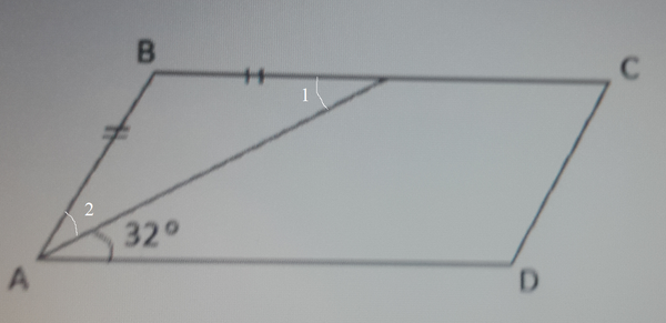 ∠ 1=32 градусов - внутренние накрест лежащие углы Δ АВС - равнобедренный, так как ∠ 1= ∠ 2=32 градусов ∠ A=32 ° +32 ° =64 ° ∠ A= ∠ C=64 ° ( противоположные углы параллелограмма равны