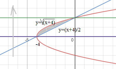 Рисуем область: y=2 y=0 x=2y-4 x=y^2-4 См. рис. Входим в область по направлению оси Оу -4 ≤ х ≤ 0 (х+4)/2 ≤ у ≤ sqrt(x+4) О т в е т. ∫ ^(0)_(-4) dx∫ ^(sqrt(x+4))_((x+4)/2)f(x;y)dy