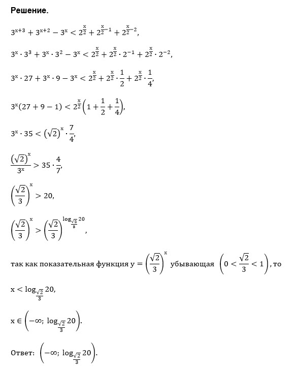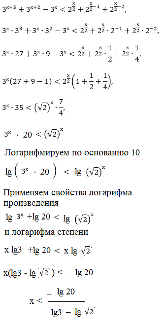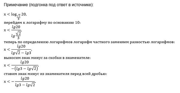 Скажите пожалуйста, вы можете решить это неравенство, чтобы ответ был х< - lg20/lg3-lg√2 ? В ответах написано, ответ может быть в другом виде, но все же хочется понять, как они до такого дошли