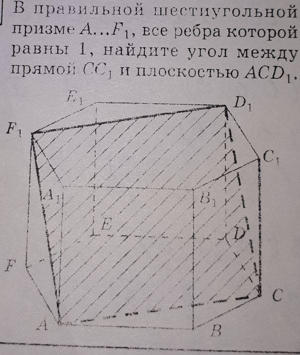В правильной шестиугольной призме A...F1, все ребра которой равны 1 , найдите угол между прямой СС1 и плоскостью АСD1.