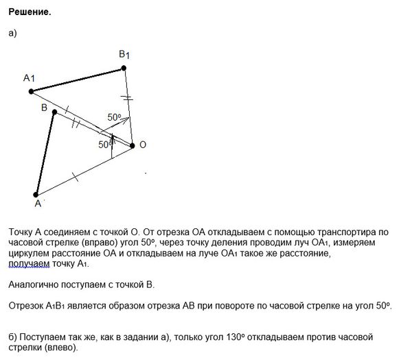 а) на угол 50 градусов вокруг точки О по часовой стрелке;