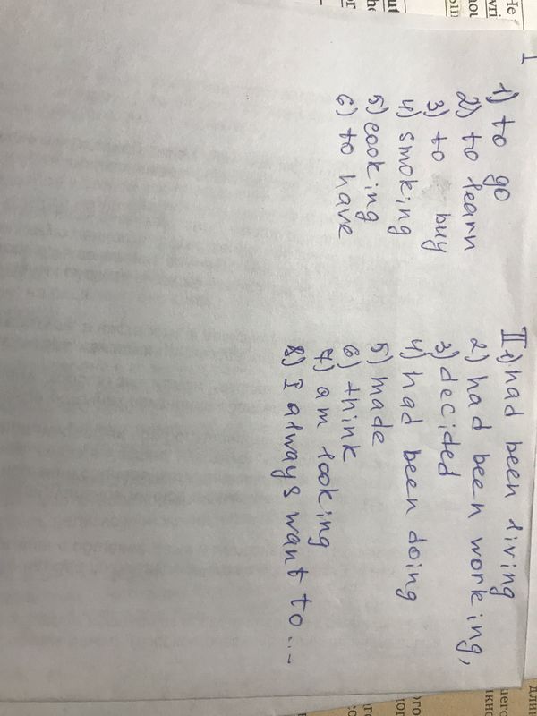 Complete the sentences with the - ing or (to) infinitive form of the verb. 1) Are you looking forward to (go) on holiday? 2) I’ve decided __ (learn) to swim this year. 3) Pam doesn’t need __(buy) a new bicycle. 4) He should stop __(smoke). It’s an awful habit. 5) Brian really enjoys _ (cook). 6) Do you want _ (have) dinner outside tonight? ++++++++++++++++++++++++++++++++++++++++++++++++++ Complete with the present perfect simple or continuous form of the verbs. Lisa Connor is bored with her life. She (1) ______________ (live) in the same town since she was born, and she (2) ______________ (work) at the post office since she left school. But now Lisa (3) ______________ (decide) that it’s time for a change. She said, ‘I (4) ______________ (do) this job for a long time, and I (5) ______________ (make) a lot of friends, but I (6) ______________ (think) of leaving my job for a while. For the past few weeks I (7) ______________ (look) for a new job. I (8) ______________ (always / want) to be rich and famous, so I’m thinking of becoming an actor.’ Good luck, Lisa.