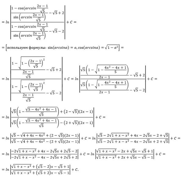 =- ∫ dt/sqrt((t-(1/2))^2-(5/4))= [b]- ln|t - (1/2)+sqrt(t^2-t-1)|+С[/b], где