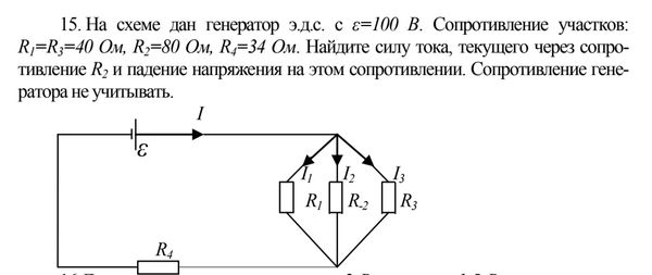 На схеме дан генератор эдс с ε = 100 В. Сопротивление участков: R1=R3=40 Om, R2=80 Om, R4 =34 Om. Найдите силу тока, текущего через сопротивление R2 и падение напряжения на этом сопротивлении. Сопротивление генератора не учитывать.