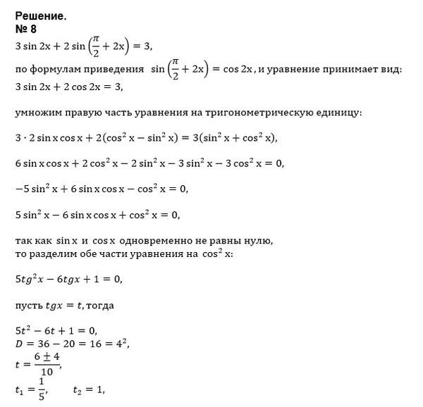 8) Пусть х1 - меньший, а х2 - больший из корней уравнения 3sin2x +2sin(π/2 + 2x) = 3, принадлежащих интервалу (0 ° , 90 ° ). Найдите значение выражения х2*tgx1 .