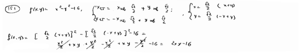 Дана функция f (x, y)=x^2–y^2–16. Определить выражение этой функции в новой системе координат, если координатные оси повернуты на угол –45 градусов.