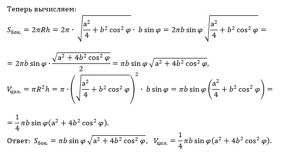4. В нижнем основании цилиндра проведена хорда, длина которой равна а. Отрезок b, который соединяет центр верхнего основания с серединой проведенной хорды, образует с плоскостью основания угол φ . Определить боковую поверхность и объем цилиндра.
