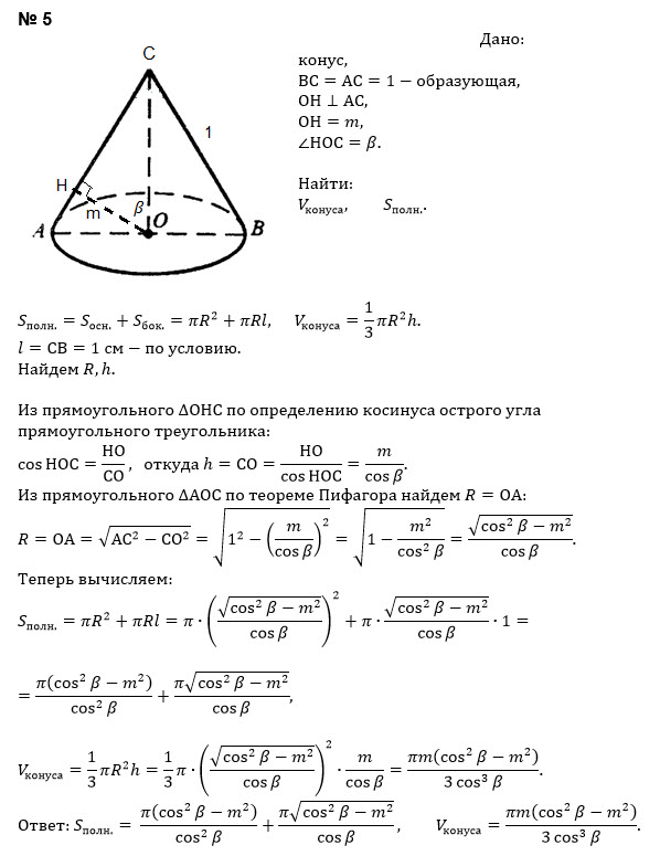5. Из центра основания конуса к его образующей проведен перпендикуляр m , который образует с его высотой угол β . Образующая конуса равна 1.Определите объем и полную поверхность конуса.