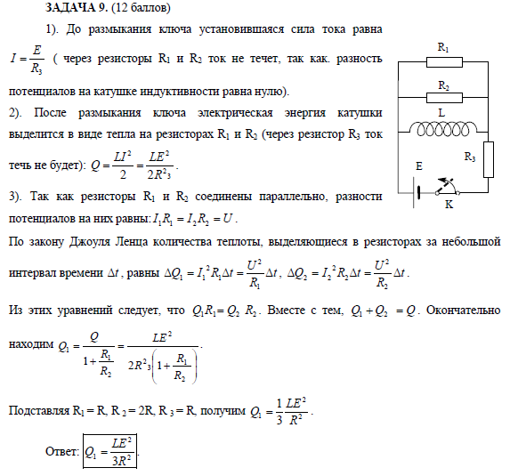В электрической цепи, представленной на рисунке, ключ К в начальный момент замкнут, и по цепи идет постоянный ток. Какое количество теплоты выделится в резисторе R1 после размыкания ключа. Параметры элементов цепи: индуктивность катушки равна L, R1 = R, R 2 = 2R, R 3= R, ЭДС источника тока равна Е. Активным сопротивлением катушки и сопротивлением источника тока пренебречь.