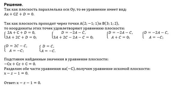 написать уравнение плоскости, параллельной оси Оy и проходящей через точки А(2,-1,1) и В(3,1,2)