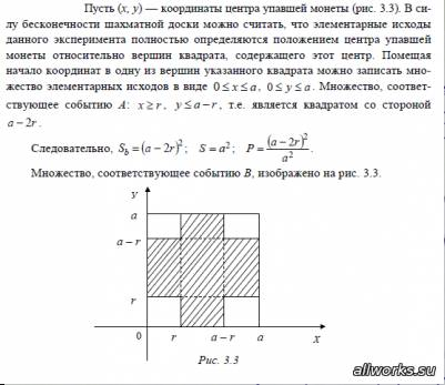 На плоскость с нанесенной сеткой квадратов со стороной 6 см наудачу брошена монета радиуса 2 см. Найдите вероятность того, что монета упадет внутрь квадрата. О т в е т. p=(6-2*2)^2/6^2=4/36= [b]1/9[/b]