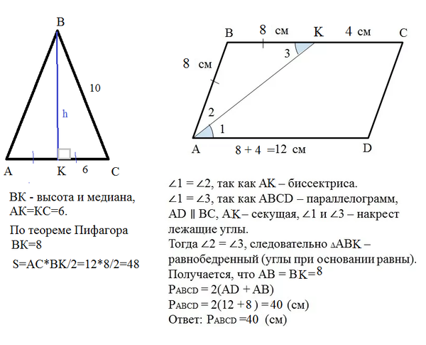 1 .Боковая сторона равнобедренного треугольника равна 10 см, а его основание 12 см. Найдите 11 площадь треугольника. 2.Биссектриса угла А параллелограмма АВСД делит сторону ВС на отрезки ВК и КС. равные соответственно 8 см и 4 см. Найдите периметр параллелограмма.
