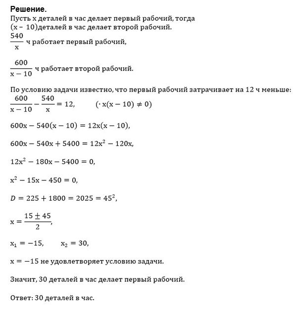 На изготовление 540 деталей первый рабочий затрачивает на 12 часов меньше, чем второй рабочий на изготовление 600 деталей. Известно, что первый рабочий за час делает на 10 деталей больше, чем второй. Сколько детален в час делает первый рабочий?
