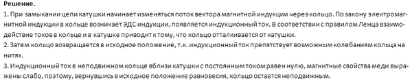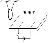 Замкнутое медное кольцо подвешено на длинных нитях вблизи катушки индуктивности, закрепленной на столе и подключенной к источнику постоянного тока (см. рисунок). Первоначально электрическая цепь катушки разомкнута. Как будет двигаться кольцо при замыкании цепи? Ответ поясните, используя физические закономерности.