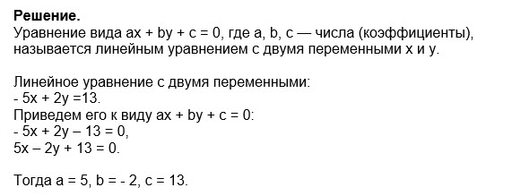 б) Наверное, там должно быть -5х+2у=13 ( иначе -5 и 13 можно привести подобные) Это линейное уравнение вида ax+by=с [b]a=-5; b=2 c=13[/b]