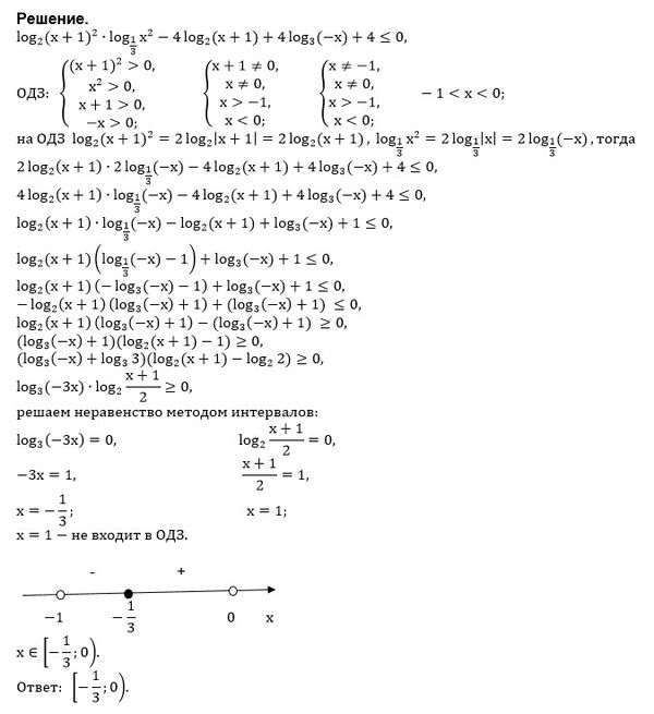 log2(x+1)^2*log(1/3)x^2 - 4log2(x+1) + 4log3(-x) + 4 ≤ 0