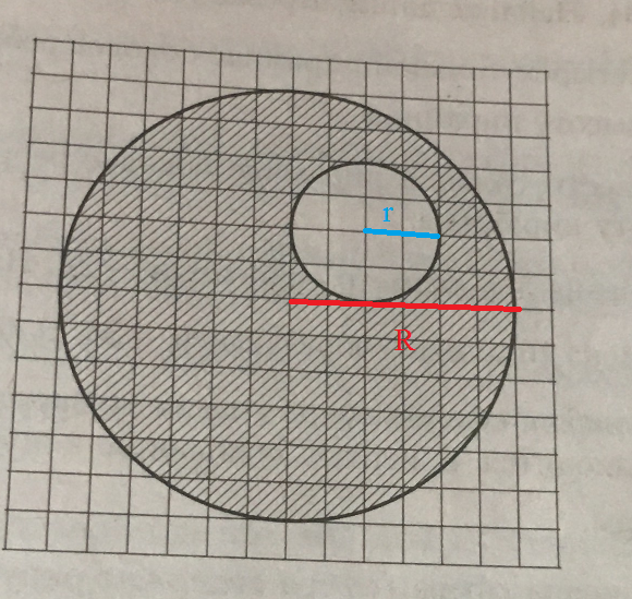 3.4.74. На клетчатой бумаге нарисовано два курга. Площадь внутренного курга равна 4. Найти площадь заштрихованной фигуры.