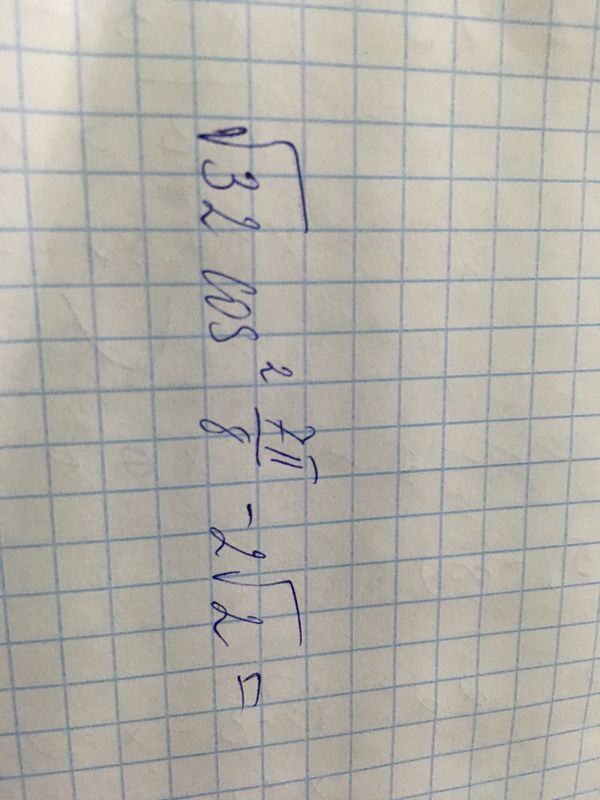 sqrt(32)=sqrt(16*2)=4sqrt(2) Формула: [b]2cos^2 α -1= cos2 α [/b] 4sqrt(2)cos^2(7π/8)-2sqrt(2)= 2sqrt(2)*(2cos^2(7π/8)-1)= =sqrt(2)(cos14π/8)=sqrt(2)*(cos(7π/4))=sqrt(2)*(cos(2π - (π/4))= =sqrt(2)*cos(π/4)=sqrt(2)*(sqrt(2)/2)=1