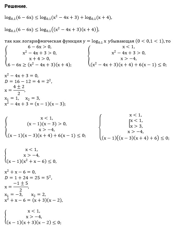 log_(0,1) (6-6x) ≤ log_(0,1) (x^2-4x+3)*(x+4)