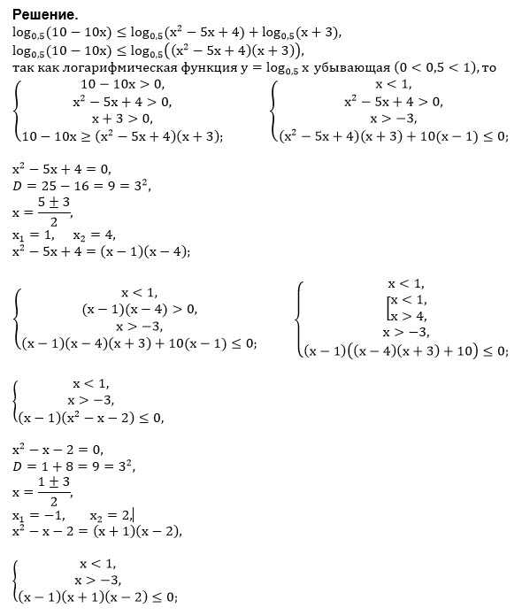 log 0.5 (10-10x) ≤ log 0.5(x^(2)-5x+4)+log 0.5(x+3)