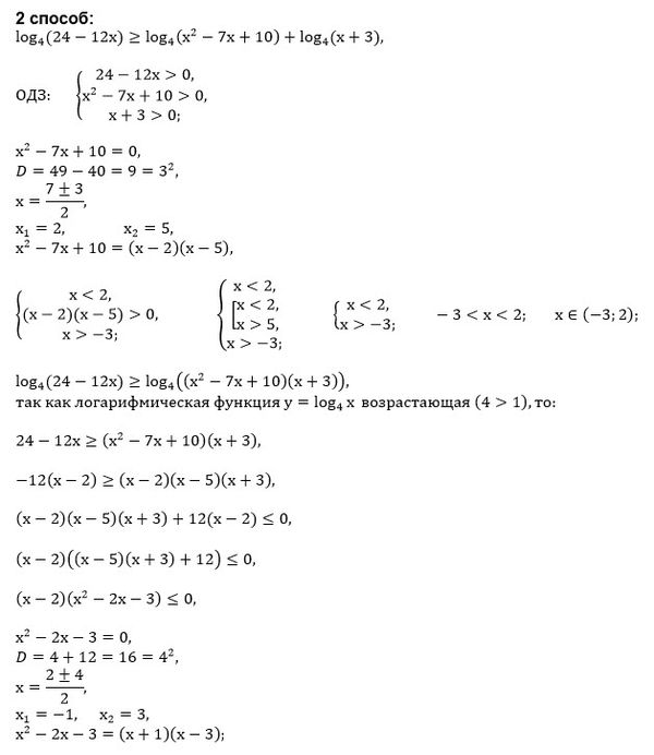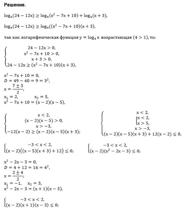 log_(4) (24-12x) ≥ log_(4) (x^2-7x+10)*(x+3)