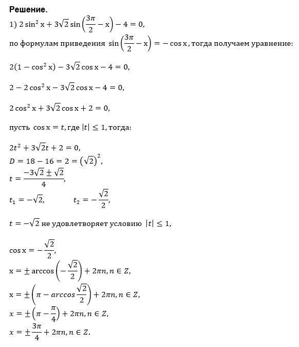 1) Решите уравнение 2sin^2x - 3sqrt(2)sin (3Pi/2) - 4 = 0 2) Найдите корни, принадлежащие отрезку [Pi; 5Pi/6]