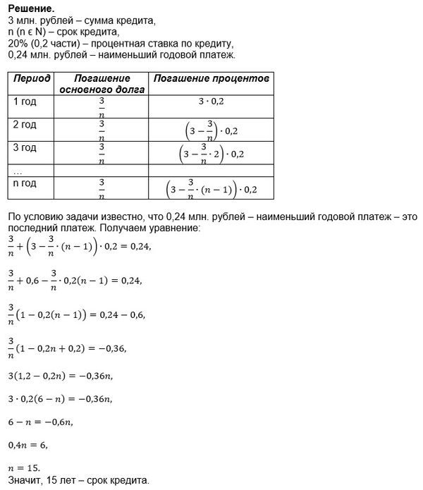 Чему будет равна общая сумма выплат после полного погашения кредита, если наименьший годовой платёж составит 0,24 млн рублей?