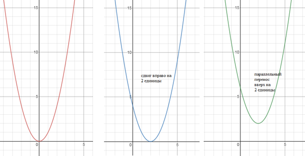 y=x^2 - парабола ветви вверх, проходит через точки (-3;9);(-2;4);(-1;1);(0;0);(1;1);(2;4);(3;9) y=(x-2)^2 - сдвиг предыдущего графика на 2 единицы вправо y=(x-2)^2+2 - параллельный перенос на 2 единицы вверх графиrf y=(x-2)^2