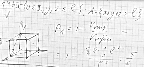 Какова вероятность того, что сумма трех наудачу взятых отрезков, длина каждого из которых не превосходит l, будет больше l?
