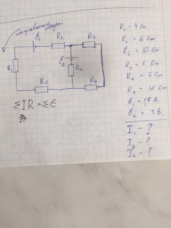 I1(R2+R1+R5)+I4R4=e1+e2 - для левого контура I4*R4+I6*R3+I6*R6=e2 - для правого контура I1(R2+R1+R5)-I6*(R6+R3)=e1 - для "внешнего" контура Подставляем значения, решаем СЛУ, получаем I1=I4=I6=0,15А