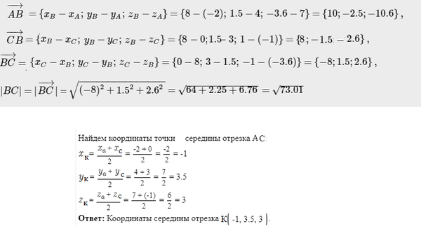 Даны точки А(-2;4;7), В(8;1,5;-3,6), С(0;3;-1).
