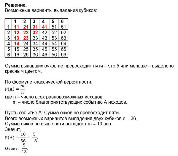 Бросаются две игральные кости. Определить вероятность того, что сумма выпавших очков не превосходит пяти.