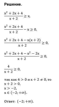 Переносим х влево и сравниваем разность с нулем: (x^2+2x+4)/(x+2)- x ≥ 0 Приводим к общему знаменателю: (x^2+2x+4 - x *(x+2))/(x+2) ≥ 0 (x^2+2x+4 - x ^2-2x)/(x+2) ≥ 0 4/(x+2)≥ 0 ⇒ x+2≥ 0 и х+2≠0 Поэтому получаем x+2 >0 х > -2 О т в е т. (-2;+ ∞ )