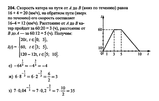 Катер отправляется от пристани А и идет вниз по реке к пристани В, до которой 60 км. После двухчасовой стоянки на пристани В он возвращается обратно. Расстояние l(в километрах) катера от пристани А зависит от времени t, отсчитываемого в часах с момента отправления его из А до момента возвращения. Собственная скорость катера 16 км/ч, скорость течения 4 км/ч. Задайте l как функцию от t формулами, постройте график функции, опишите по графику ее свойства и объясните их физический смысл.