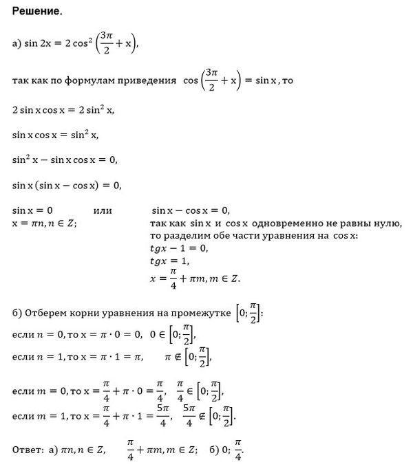 Найдите корни уравнения sin 2x = 2cos^2 (3π / 2+x) на промежутке[0; π/ 2]