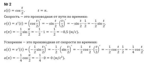 Задание 2. Решить задачу: Материальная точка движется прямолинейно по закону s(t) = cos(t/2) (м. время - в секундах). Определить скорость и ускорение материальной точки в момент времени t = Pi с. (5 баллов)