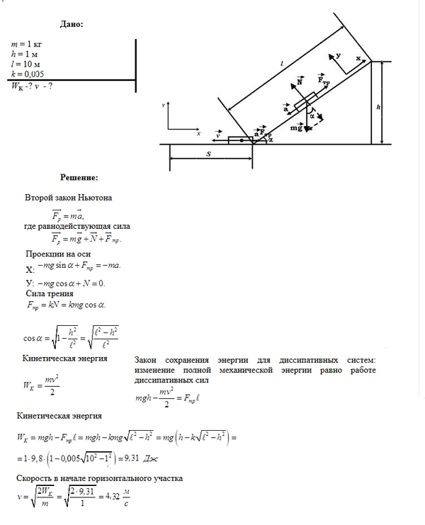 . Дана масса 1кг тела скатывающегося с горкти высотой h=1 и длинной l=10.коэффициент трения 0.005. Найти скорость у конца горки и кинетическую энергию тела
