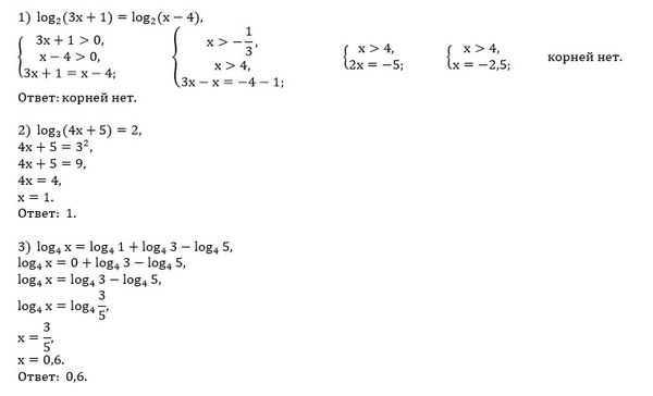 1) log2(3x+1)=log2(x-4) 2) log3(4x+5)=2 3) log4x=log4 1+log4 3-log4 5 Ребят помогите срочно надо найти х