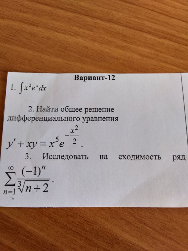 Вариант-12 1. ∫ x²eˣ dx 2. Найти общее решение дифференциального уравнения y' + xy = x⁵e^(-x²/2). 3. Исследовать на сходимость ряд ∞ Σ (-1)ⁿ/³√n + 2. n=1