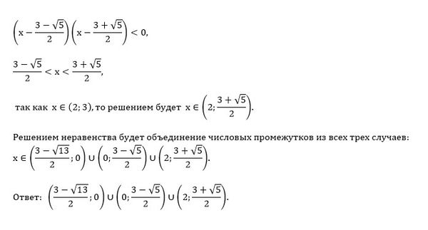 x ∈ ((3-sqrt(13))/2;(3+sqrt(13))/2) ИЛИ x < (3-sqrt(5))/2 или x >(3+sqrt(5))/2