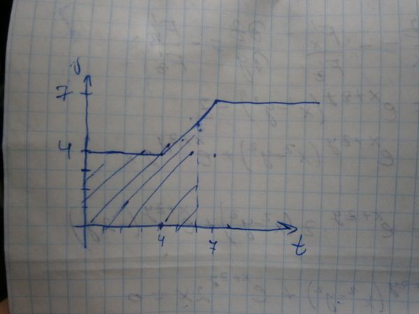 Материальная точка, имеющая начальную скорость 4м/с в течении 4 с двигалась равномерно, затем 3 с с ускорением 1 м/с, после этого двигалась равномерно. Постройте график зависимости v(t) и найдите путь, пройденный за 6 с от начала движения