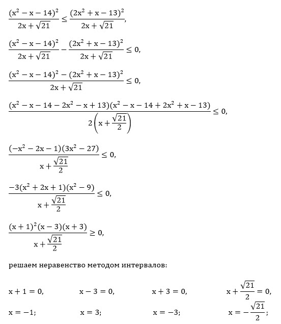 ((x^2-x-14)^2-(2x^2+x-13)^2)/(2x+sqrt(21)) ≤ 0