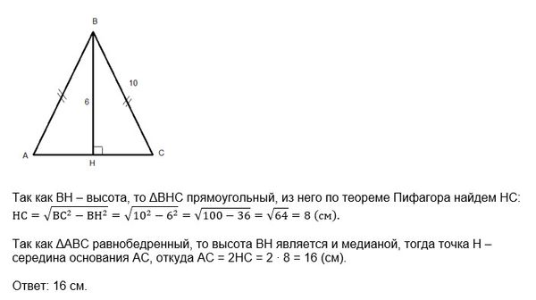 Найдите длину основания равнобедренного треугольника, если его боковая сторона имеет длину 10 см, а высота, проведенная к основанию — 6 см.