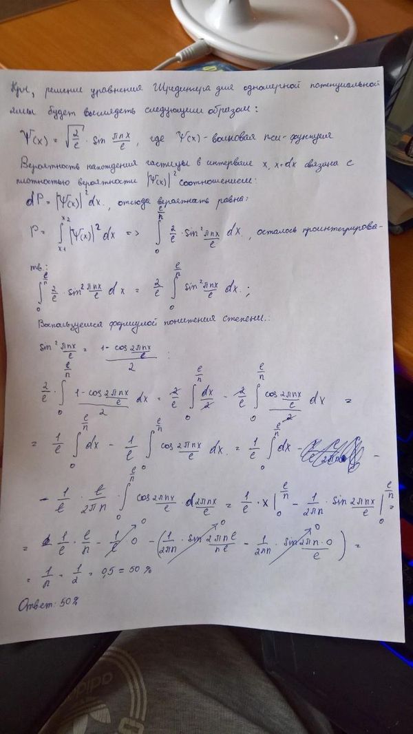 Электрон находится в одномерной глубокой потенциальной яме в возбуждённом состоянии. На ширине l ямы укладывается n=2 полуволн де Бройля. Определите вероятность нахождения электрона в интервале ln ямы.